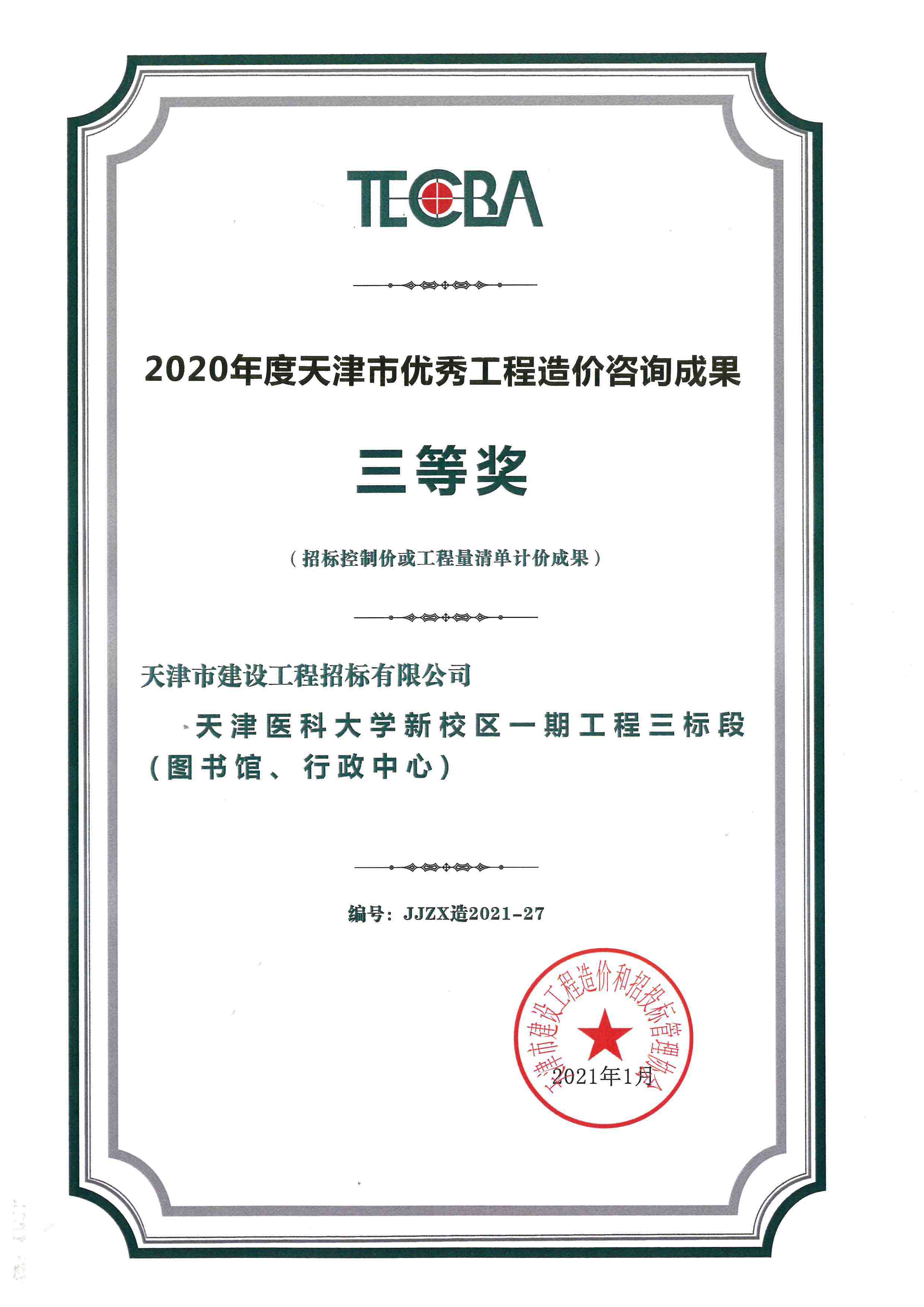 2020年度天津市優(yōu)秀工程造價(jià)咨詢(xún)成果三等獎